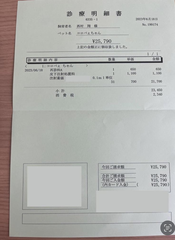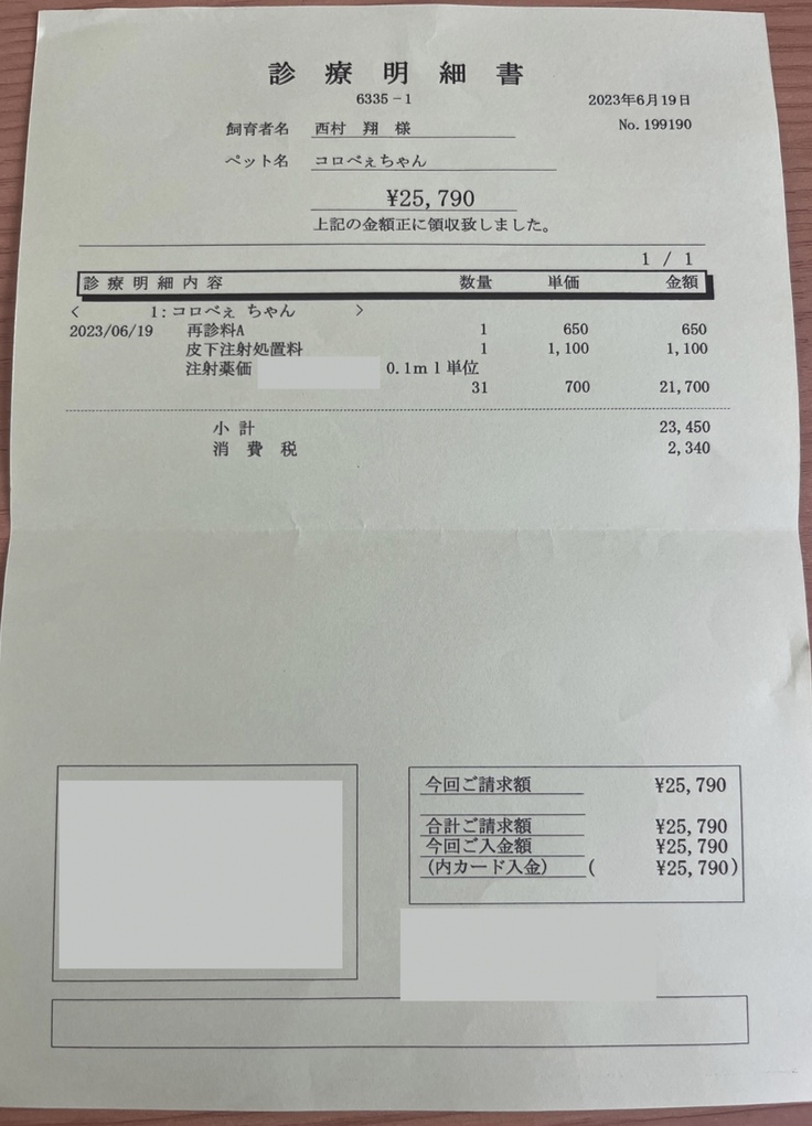 6/17時点での体重が3.14kgのため、体重1kgに対して1ml=¥7,000