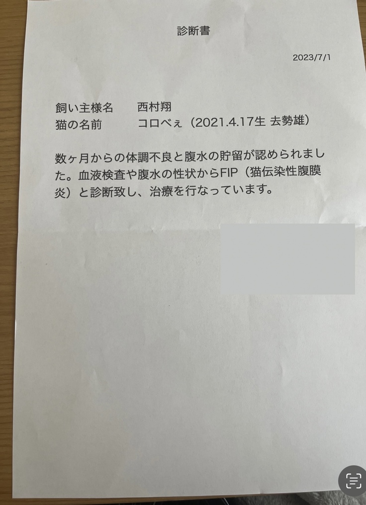 2023年6月17日に難病の猫伝染性腹膜炎(FIP)と診断され、現在闘病中です。