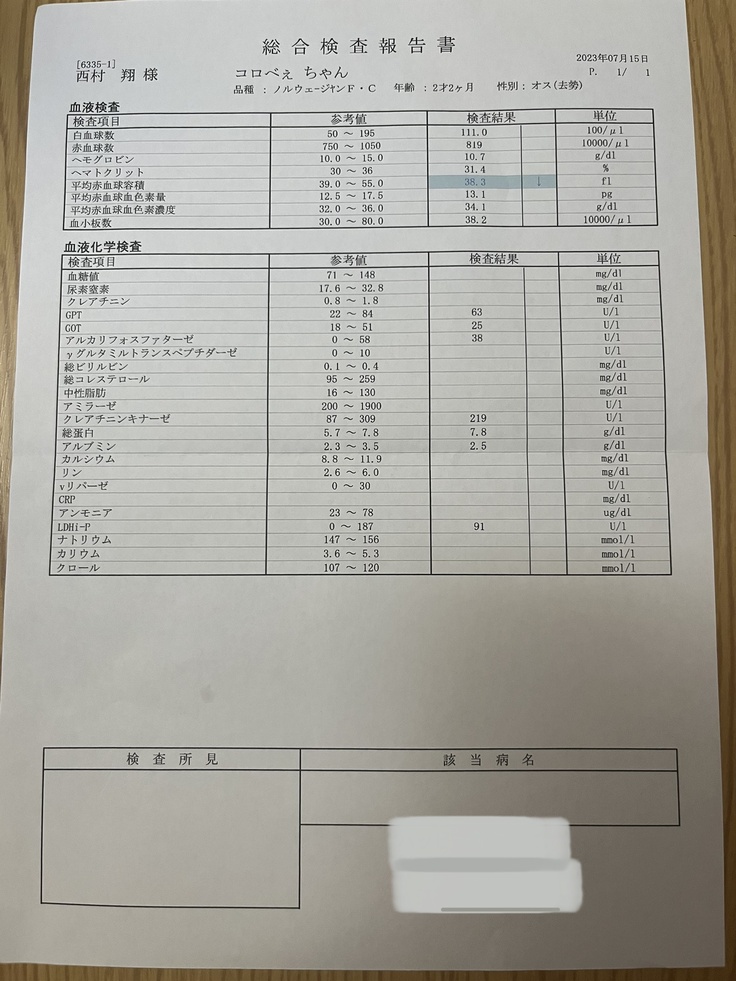 2月下旬に食欲がなくなりかかりつけ医に連れて行ったところ、リンパ節の腫れが指摘され悪性リンパ腫ではないかと疑われました。検査の結果、悪性リンパ腫ではないことが判明し、ステロイドで治療したところ、腫れは小さくなり、食欲も戻ったことから経過観察となりました。