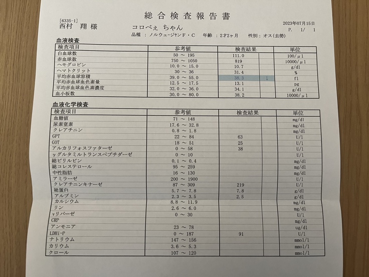 さて、血液検査の結果ですが、この前まで残っていた貧血が無くなり、総蛋白もギリギリ基準値内に収まりました!