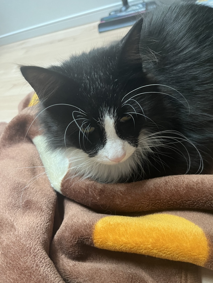 写真はママの膝掛けを占領するコロちゃんです🐈⬛🐾