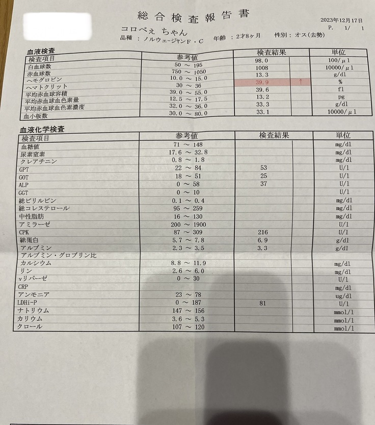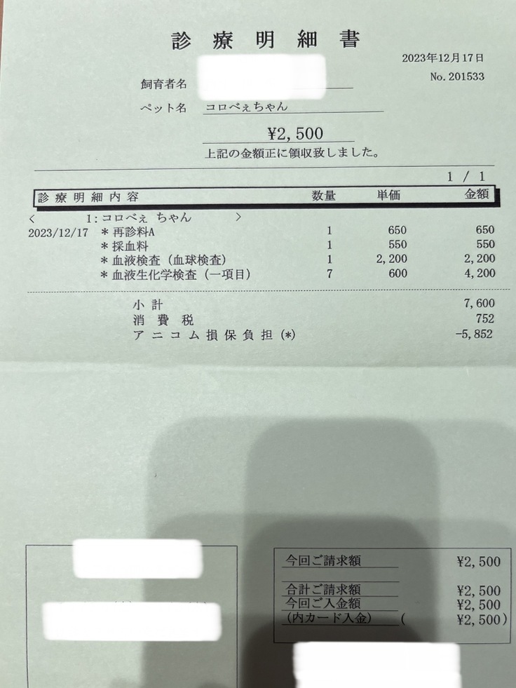 さて、遅くなりましたが先日の病院の検査結果と領収書になります。