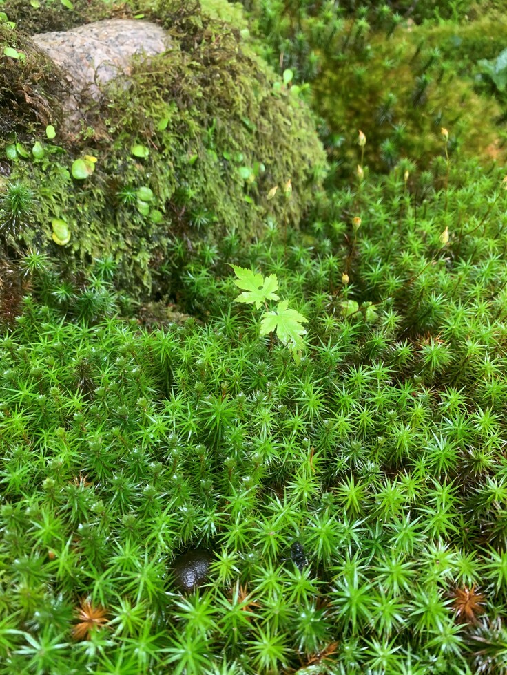 雨上がりに杉苔がきらきらと輝いています。小さなもみじも顔を出しています。