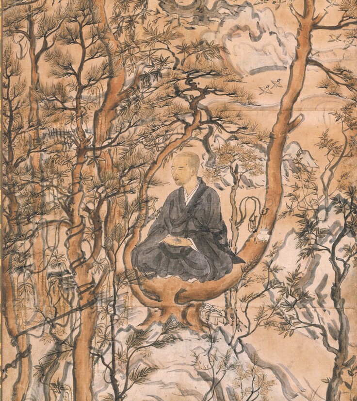 明恵上人樹上座禅像には、楞伽山で明恵上人が修行しているときの姿が描かれています。明恵上人が座る松の木があった場所には、縄床樹という石碑が残されています。