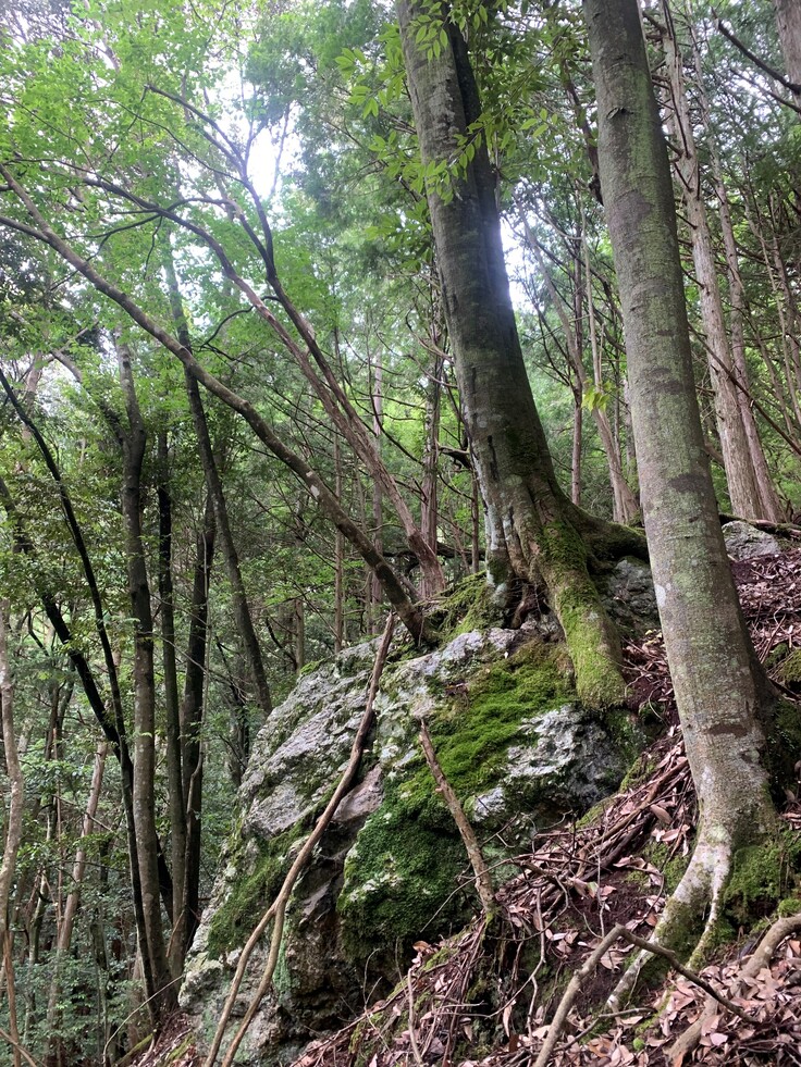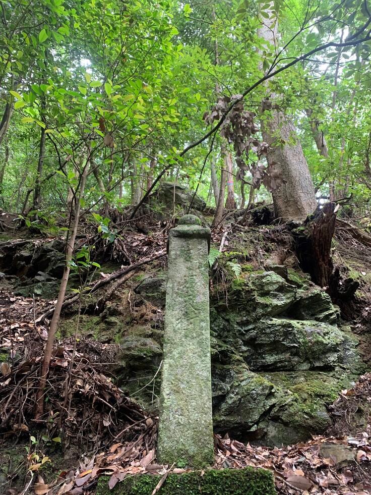 山の斜面を上がっていくと、2箇所の平地があり、そこにはそれぞれ羅婆坊と華宮殿という石碑が建っています。ここは明恵上人が結んだ草庵の跡地であり、当時はいつも近くの樹や石の上で座禅を行っていたと伝わります。宗教的な夢想や、月の歌の多くはこのような場所で記されたといわれています。
