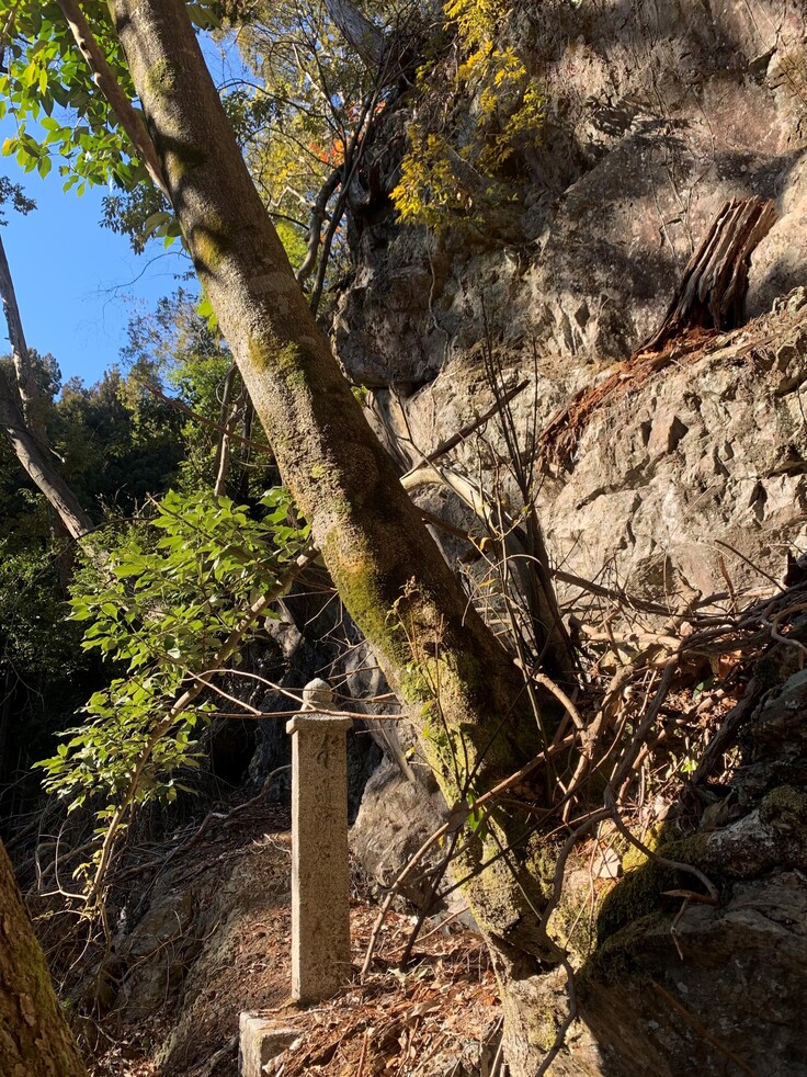 山の最奥の険しい岩場には、遺石窟と彫られた記念碑が建っています。遺跡から南方を見渡すと空が広がり、あかあかと輝く月を見た明恵上人のお姿が想像されます。