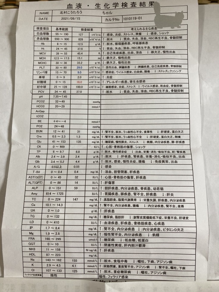 抗がん剤入治療をして、少しでも腫瘍を叩き「鋼太郎」がいつもと同じ暮らしをお家で出来る様にとのお話で治療が始まりました。抗がん剤投与した夕方に会いに行くと意識が飛んでる様な感じでした。私が「鋼太郎!」と声を掛けると目の焦点が戻り立ち上がって泣いている私の傍に来て、ご飯を食べてと言うと、少し食べて、まるで大丈夫だよと言っているように感じ、もう泣かないと決意しました。「鋼太郎」は頑張って生きようとしている。私に出来る事は何でもしようと。