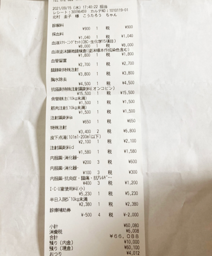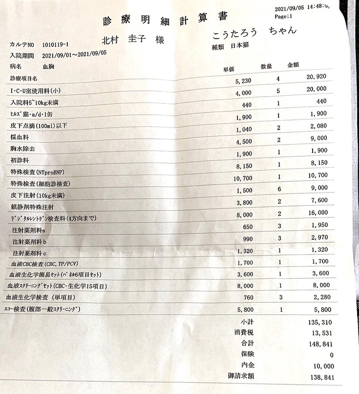 「鋼太郎」の治療はまだまだこれからも続きます。病院代に25万円そして酸素室レンタル代、タクシー代などなどあっと言う間に30万円飛んでいきました。引っ越しで貯金もなくなりこれからパートをしてと思っていましたが今は「鋼太郎」から目が離せない毎日です。