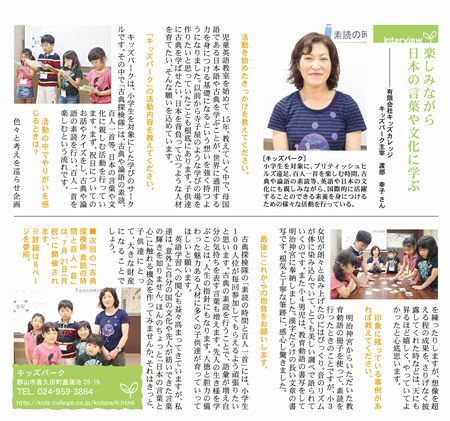 福島県郡山市で、小学生を対象に、学びのサークル「キッズパーク」を主宰。古典探検隊では、論語や古典の素読、百人一首等を毎月行っています。