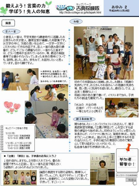 そのために、まず「キッズパーク古典探検隊」の活動内容を、広く知ってもらうためにパンフレットを作りたい。そして、「百人一首大会」の案内チラシを作りたい、と思います。平成27年12月に作成できれば有難いと思っています。作成するパンフレットは、今までの「古典探検隊」の歩みや取り組みの内容、想いを込めたもので、たくさん配布することで参加者の窓口を増やしたいと願っております。同時に、百人一首大会の案内チラシも作って、大会を広くPRしたいと考えています。子供たちに、日本人としての背骨をしっかり身につけさせて、お天道様に恥じない立派な大人になるための力になってくださってもいい、私に力を貸してもいいという方に、ご協力をお願いできればと、切に願っております。