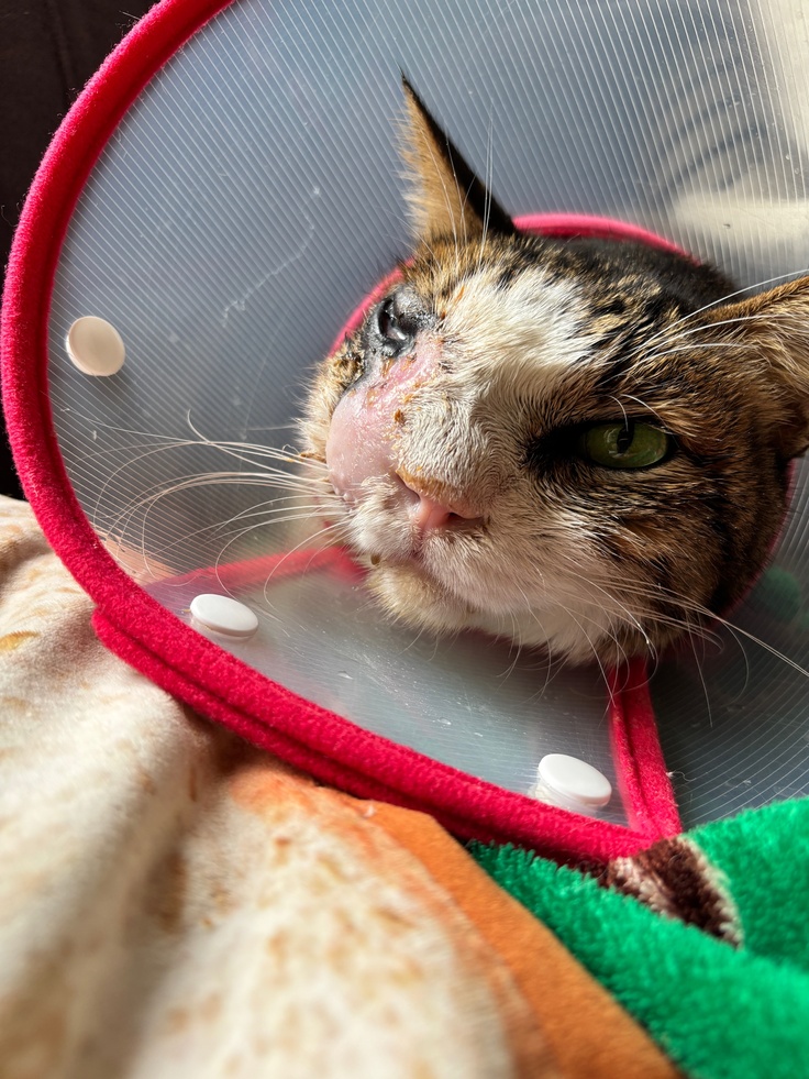 行き来のストレスと、麻酔をしての放射線照射の負担、その後の副反応の辛さなど、緊張が続いています。人間は、小鉄に給餌給水をし、顔を吹いて、かわいがり、あまやかすくらいしかできず、不甲斐ない思いです。