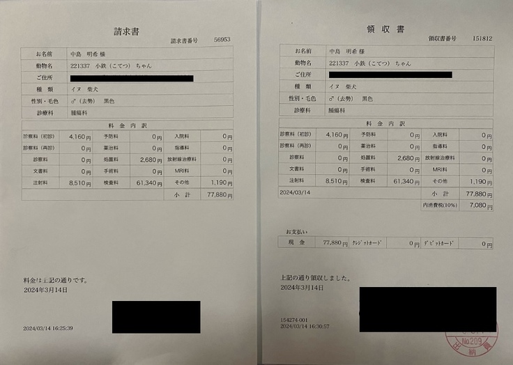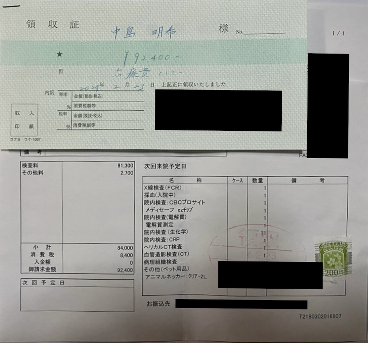 資料A:かかりつけの動物病院での血液検査,CT検査などの検査費の領収書