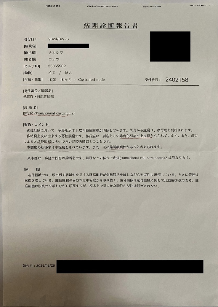 2024年03月01日、祈るような想いで待っていた病理検査の結果が、大きな動物病院から届きました。