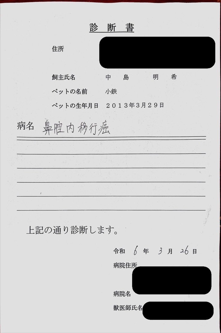 その後、鼻腔内腫瘍について色々調べ、病理検査の結果を待たず、かかりつけの動物病院に大きな病院への紹介状を書いてもらうよう頼みました。