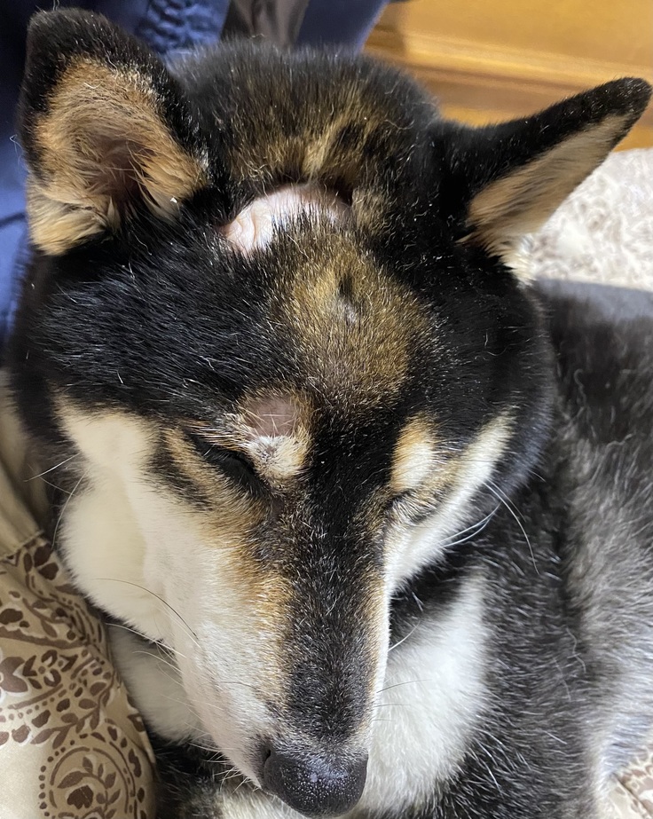 眉の上まで毛が抜けてしまい、かゆがっている。