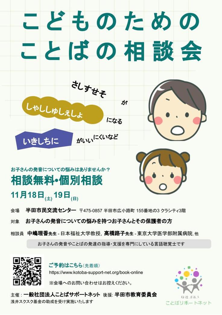 今回の相談会では、半田市教育委員会のご後援・ご協力により、機能性構音障害の紹介を含んだチラシを、市内の教育機関にご配布頂きました。