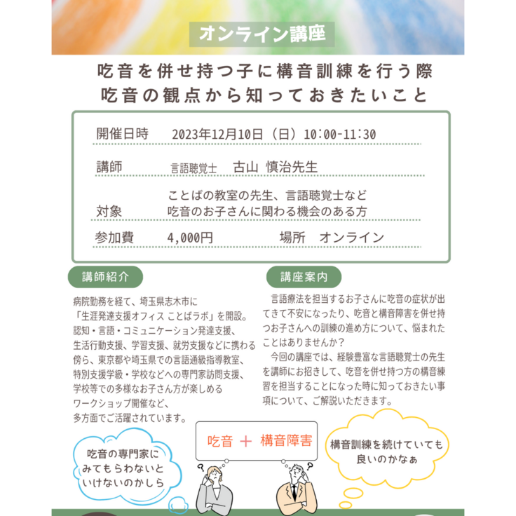 12/10(日) 言語聴覚士の古山慎治先生を講師にお迎えし、オンライン講座【吃音を併せ持つ子に構音訓練を行う際吃音の観点から知っておきたいこと】を開催いたしました。当日は、たくさんの方にご参加いただきまして、ありがとうございました。