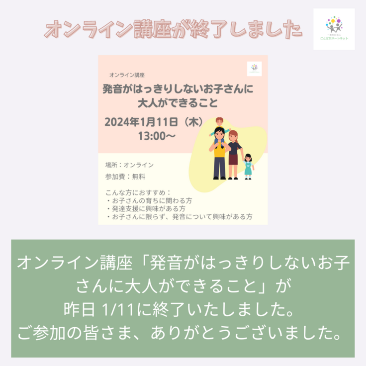 オンライン講座「発音がはっきりしないお子さんに大人ができること」が終了しました。