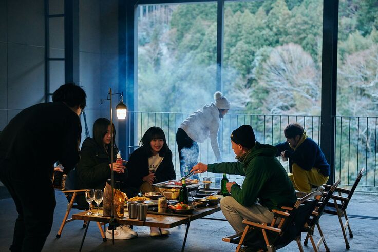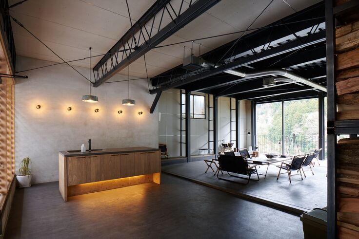 そこに吉野川を眼下に望む一棟貸しの宿「大豊の森」をオープン致しました。そこでは工場跡を半屋外のテラスとし、絶景を堪能しながら焚き火やBBQを楽しむことがきる特別な宿にすることができました。