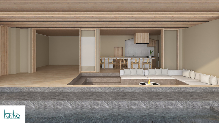 窓をすべて開放することができ、海と家との関係を緩やかにつなぐ、曖昧な空間としてのアウトドアリビング。あえて床を彫り込んで目線を低くし、ソファーでくつろぎながら太平洋はもちろん、波の音や高知の風を感じることができます。ファイアプレイスもあり、夜も火の揺らめきを楽しみながら、仲間との大切な時間を過ごしていただけます。