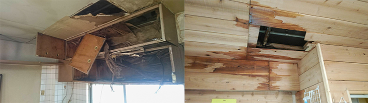 老朽化した部屋(左)を自分たちで修理して使っていますが、たびたび水漏れ等(右)が発生しています。