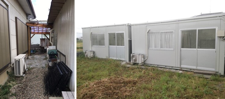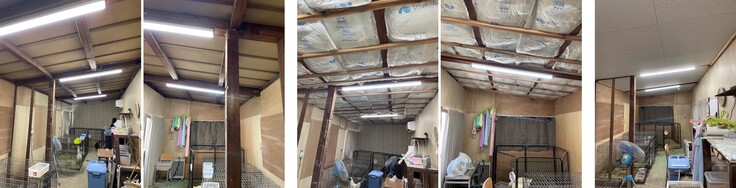 ニワトリハウスの天井、断熱材を入れる工事の施工前と施工後。