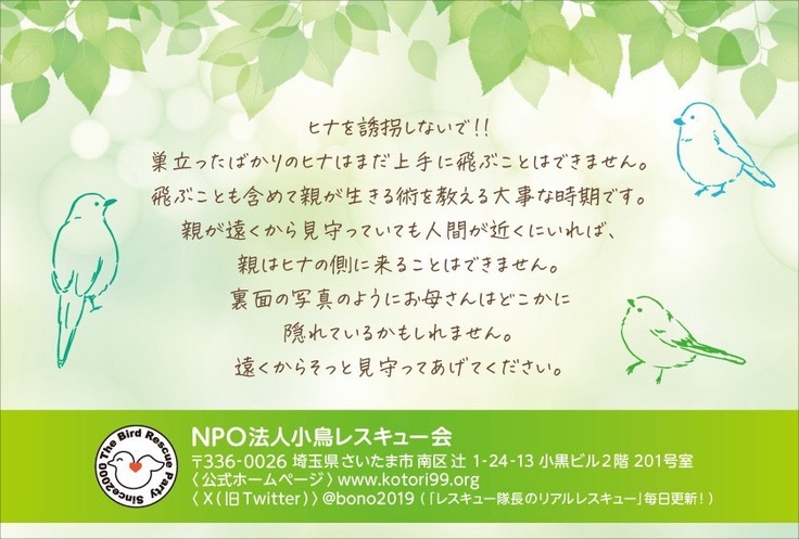 野鳥の子育てシーズンに向け「野鳥の雛を拾う=誘拐」の周知を目的に、ポストカードを作成しました。