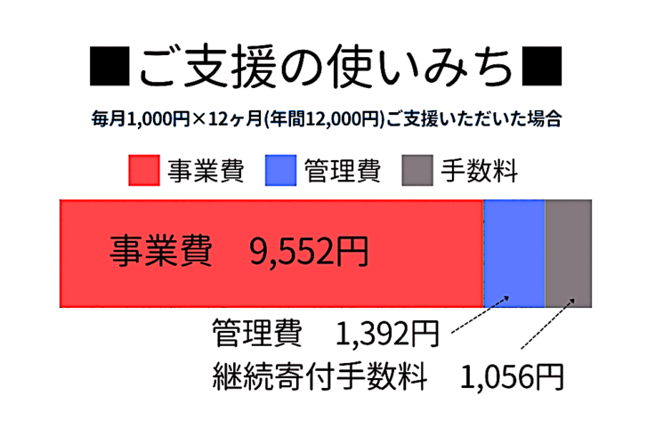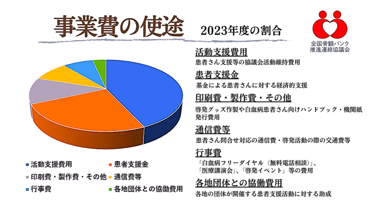皆さまのご寄付の使いみちは、今までに説明した「患者支援活動」「骨髄バンク普及啓発活動」といった活動費(事業費)として使わせていただくほか、当協議会の運営費(管理費)としても使わせていただきます。