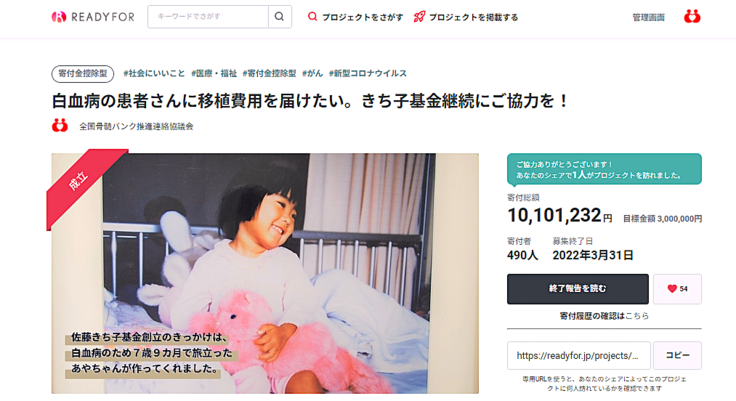 2022年のクラウドファンディングにおいては、「佐藤きち子基金」に計490人の方から総額10,101,232円ものご寄付を賜り、31人の患者さんを支援することができました。全国各地よりあたたかいご寄付をお寄せいただいた皆さまへ、改めて感謝を申し上げます。