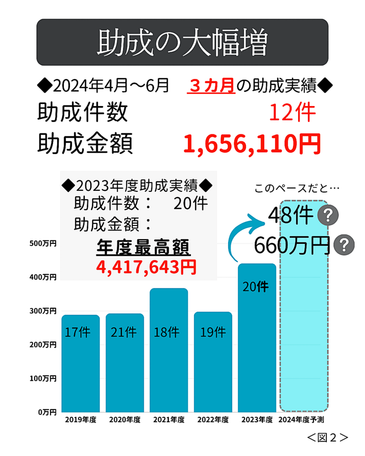 2024年度は4-6月の3カ月間だけで助成件数は20件、助成金額は165万円を超過しました。このペースだと年間の助成件数は48件、助成金額は660万円に達する計算となり、より多くの皆さまからの継続的なご支援が必要となっております。