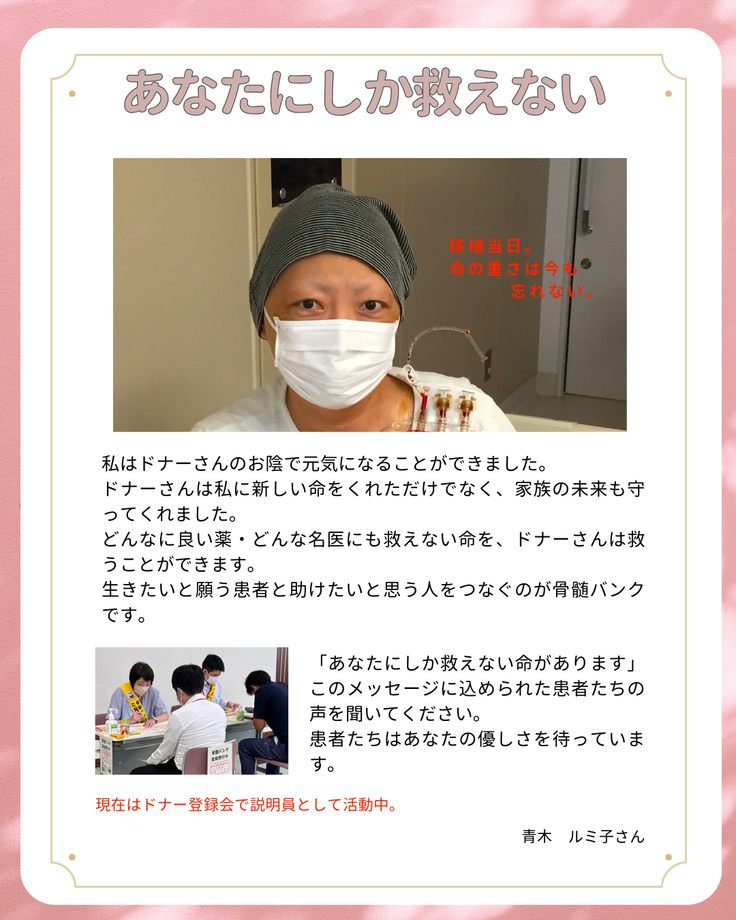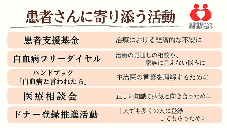 それ以外にも全国のボランティアと共に患者さんやご家族の不安や心配を少しでも取り除く医療講演会や相談会、広く骨髄バンク事業を知ってもらうための普及啓発活動にも力を入れています。