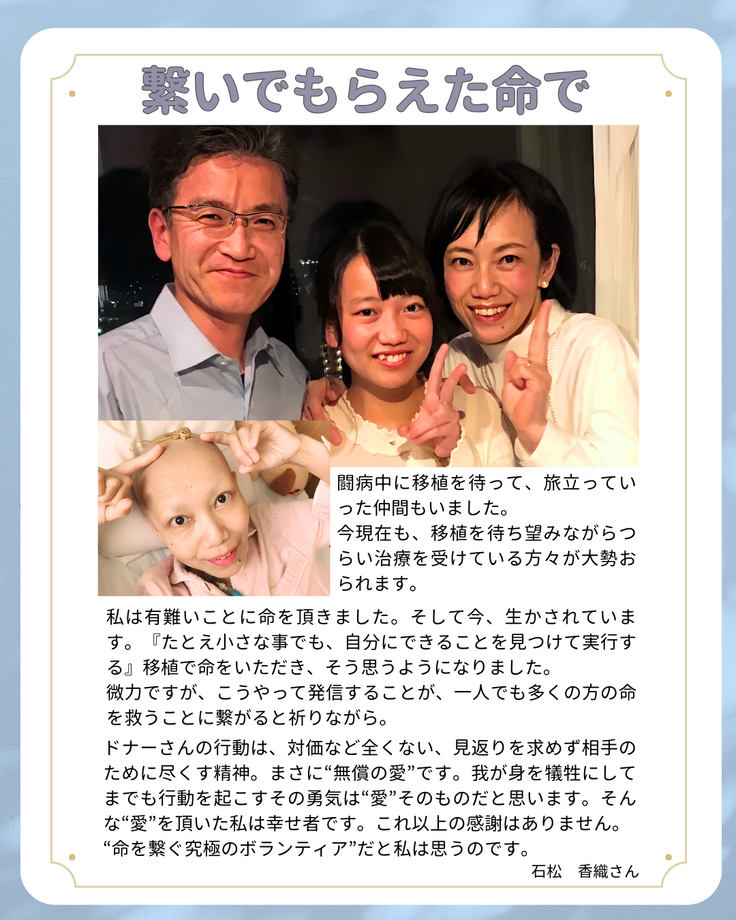 しかし、重篤な病気であることに変わりはありません。適合するドナーが現れなくて移植ができないケースがあったり、移植してもその後のGVHD(ドナーの細胞が患者の細胞を攻撃してしまう合併症)や高額な治療費、薬代に悩まされるなどして、その闘病は長く、つらいものであり、また、経済的な負担も非常に大きなものになります。