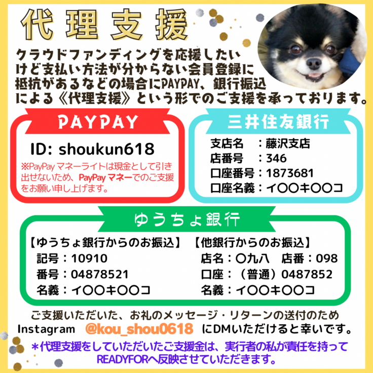 READYFORへの会員登録の方法がわからない方や登録するのに抵抗がある方向けにPayPayやゆうちょ銀行へのお振込みでご協力していただける”代理支援”という方法がございます!