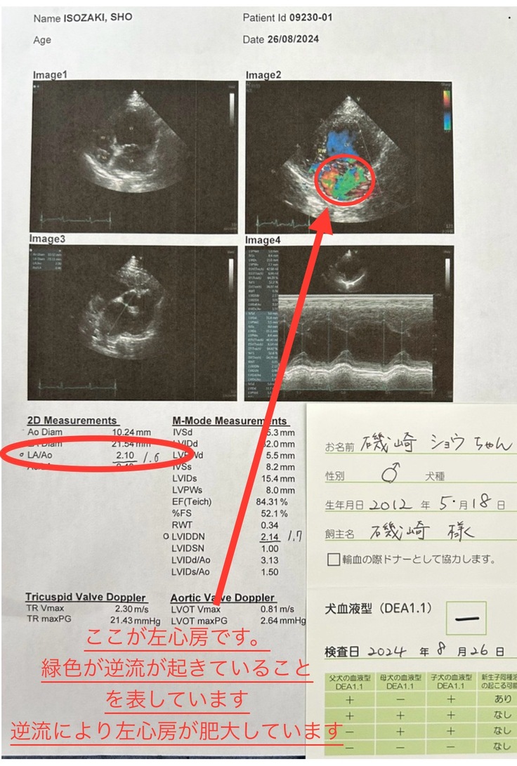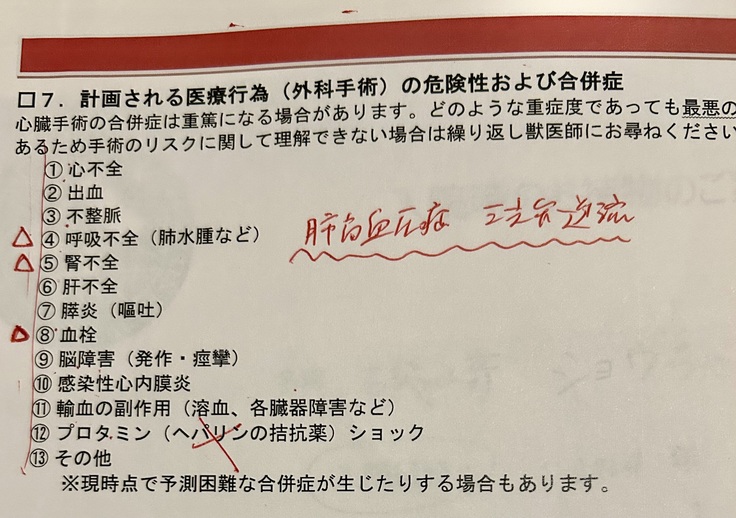 また、左心房破裂を起こしたことで、術後のリスクのひとつである、血栓ができやすくなってしまうそうで、血栓に特に注意が必要と獣医師から説明がありました。