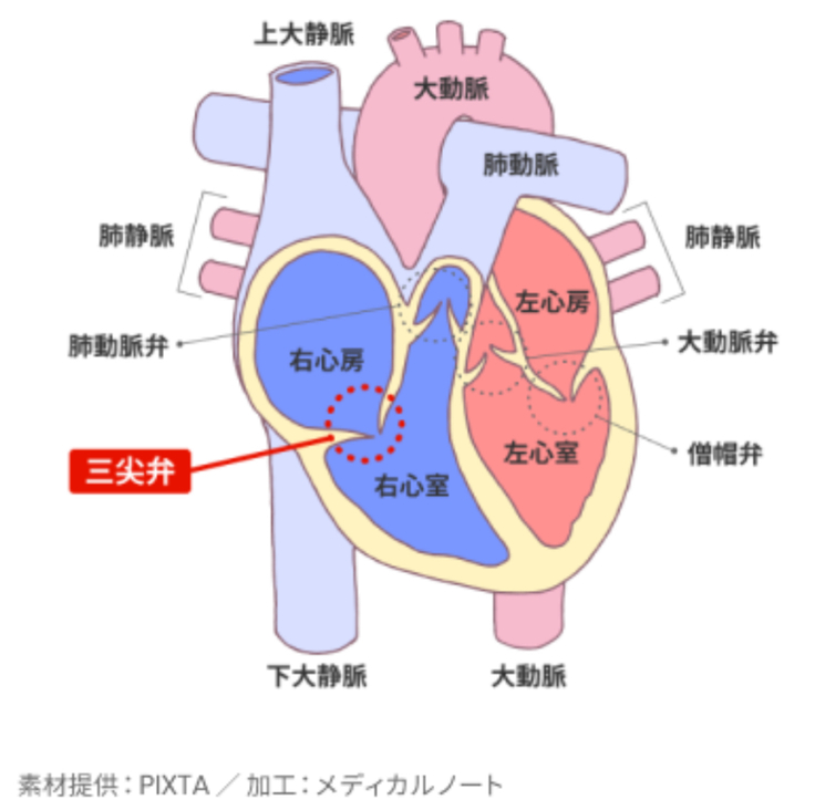 心臓弁膜症の1つで、心臓の中にある“右心房”と“右心室”と呼ばれる部屋の間にある“三尖弁”がうまく閉じなくなることにより、血液が逆流してしまう病気です。