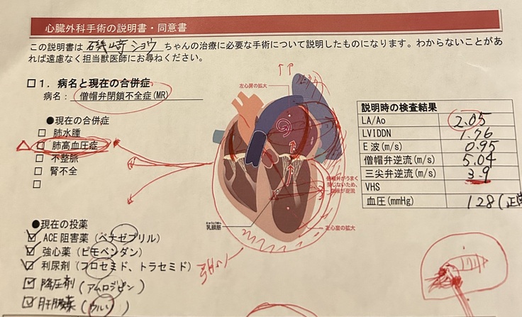 これにより、術後の肺高血圧症のリスクが高いとのことでした。僧帽弁の手術をすると自然と三尖弁閉鎖不全症も落ち着くこともあるそうですが、落ち着くか、現状維持か、術後一年ほどで進行が進むかは、僧帽弁閉鎖不全の術後次第でしかわからないそうです。