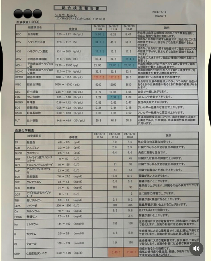 血液検査では、先月に続き関節の炎症の数値CRPが高かったですが、腎臓や肝臓、他の項目は特に問題ありませんでした。
