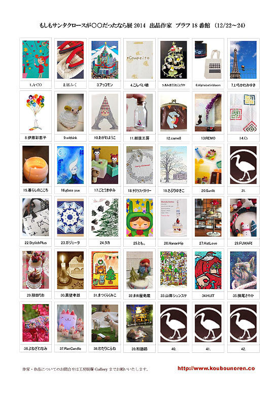 もしもサンタ展オリジナルハガキ制作と全国配布プロジェクトはこの作家40名を支援していただくプロジェクトです。各作家のアトリエイメージの一覧をこちらにも掲載いたしますので、どうぞご参照ください。
