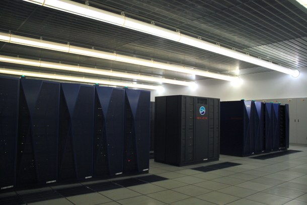 ▲動画(注:大きな稼働音がします):広い体育館のような中に何台も置かれているスパコンの数々。動画のこの光が点滅するのはスパコンではなく同じ室内に設置してある「ストレージ(記憶装置)」。室内は、稼働する機器の大きな音がする。中は湿度、温度共に調整されており、涼しい。