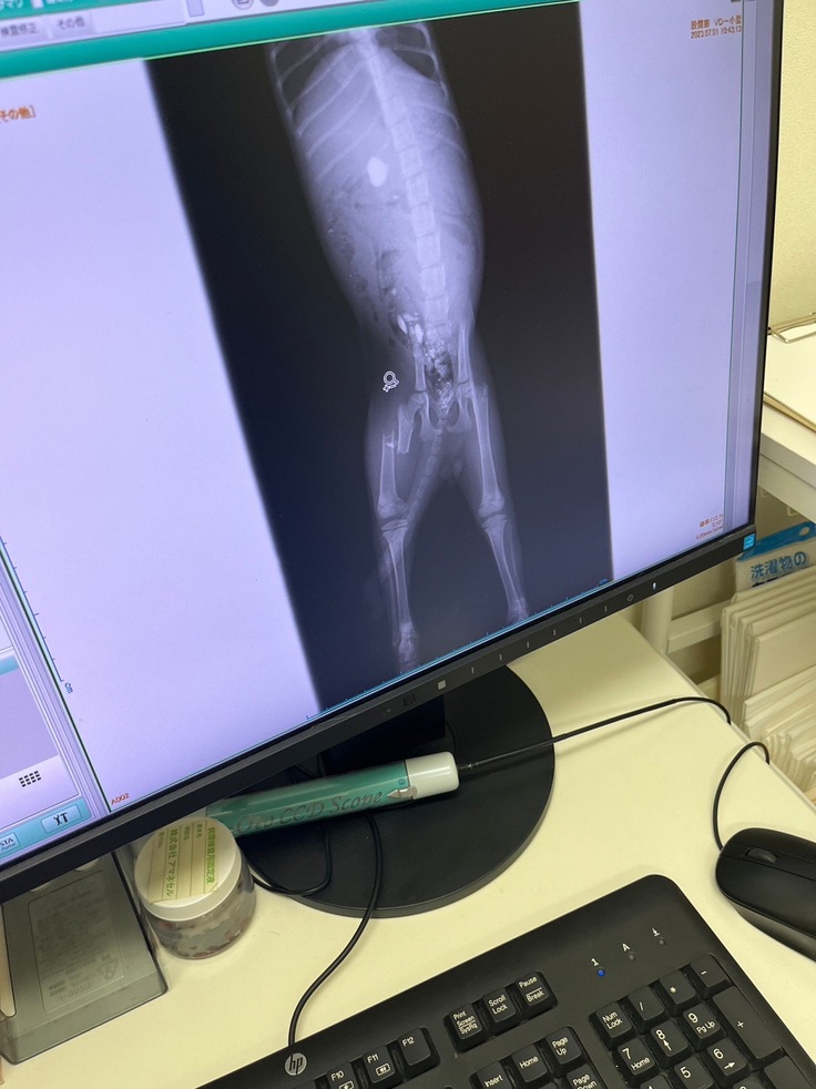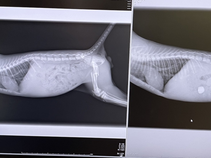 大腿骨の骨折、胃に砂利や石がある事がわかりました。