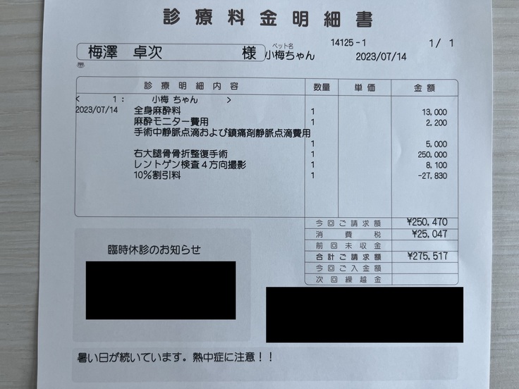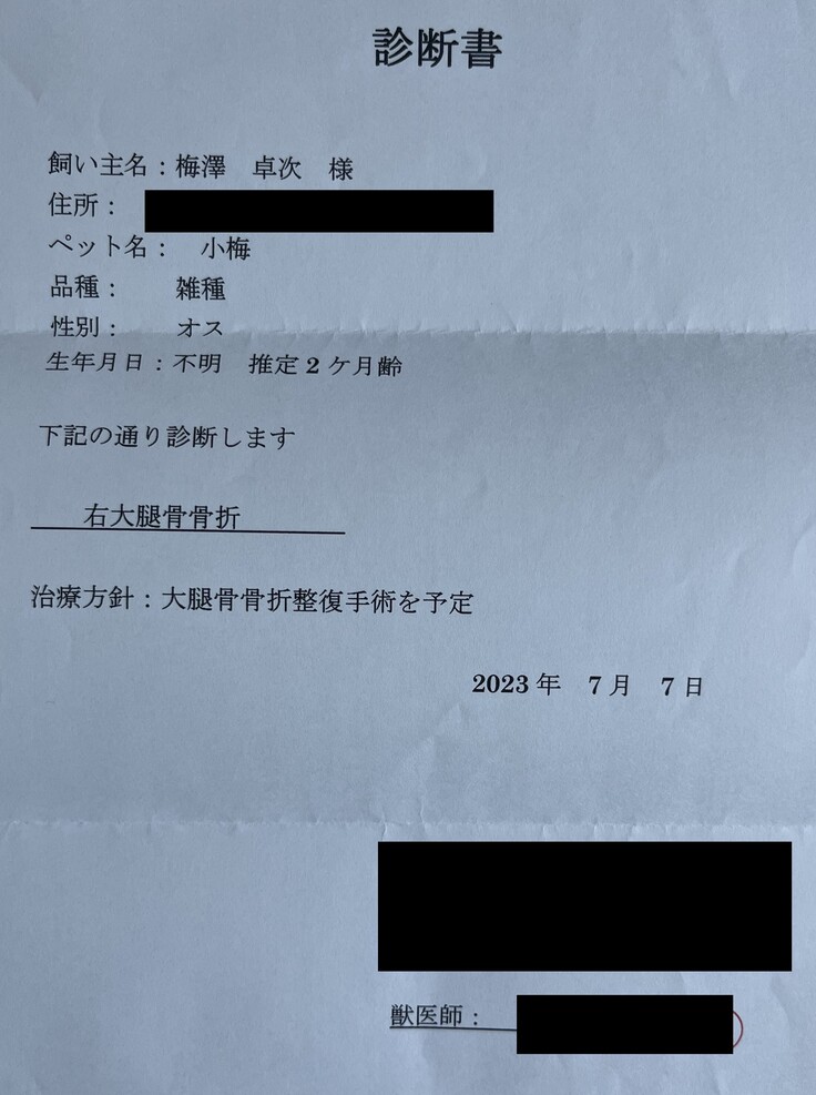 すでに支払った小梅の手術・入院・治療費の補填に充てさせて頂きます。