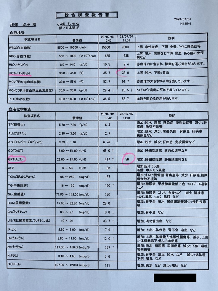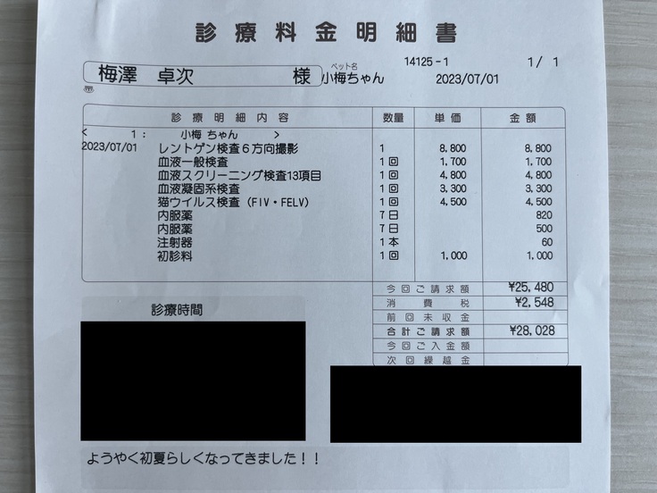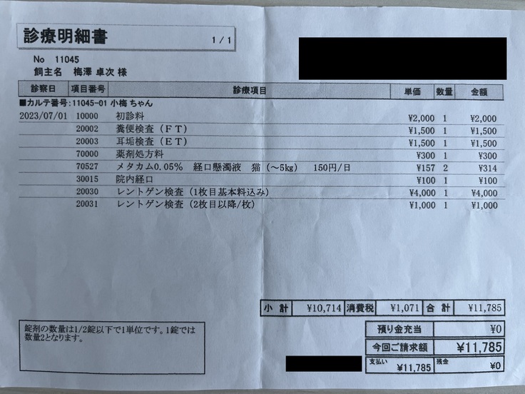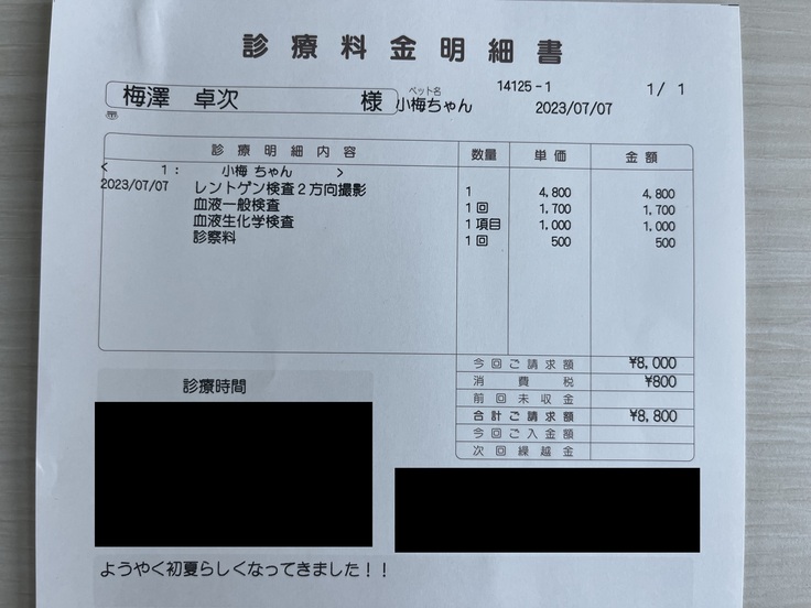 ※入院中、お腹に回虫が見つかったため入院中に予定していた三種混合ワクチン(5,280円)は延期、回虫駆除用のお薬投与しています。