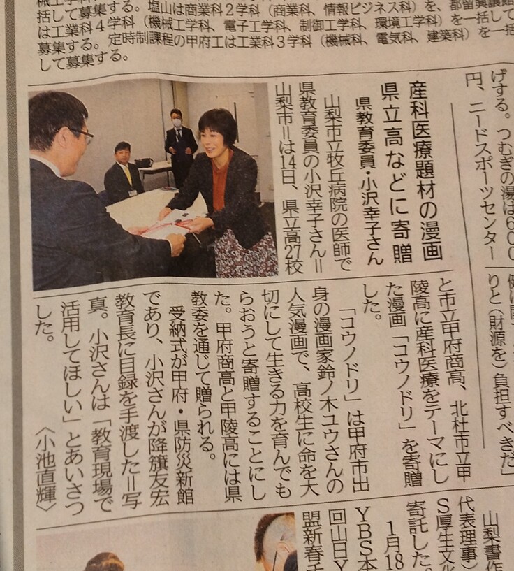 3月14日、目録を降籏教育長にお渡しし、山梨日日新聞社、毎日新聞山梨支局が取材してくださいましたので、私の患者さんたちが気が付いて、外来で一緒に喜んでくれました。