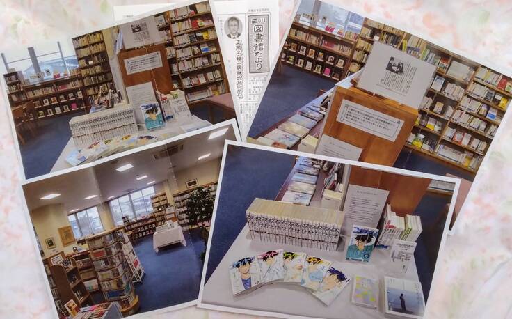 実はYさんは私のもう一つのライフワーク、ハイチ友の会の長きにわたる会員さんでした。非常に丁寧に、図書館のもっとも目に付くところに特別コーナーを作ってくださり、このコミックスが図書館に届くまでの来歴を紹介してくださるだけでなく、テーマに関連する書籍も並べておられました。