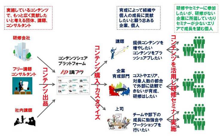 研修・育成企業がコンテンツを開発し、それを法人や個人に提供する。