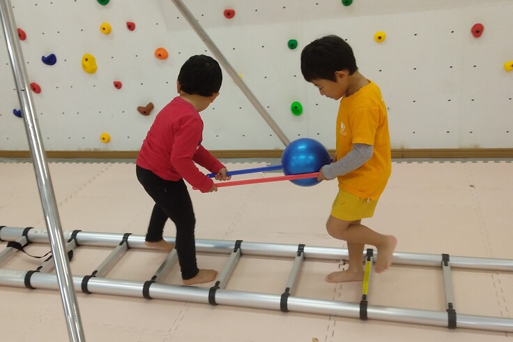 二人で一緒に息を合わせてボールを落とさないように障害物を乗り越えています