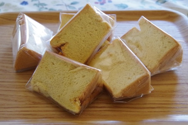 道の駅「せせらぎの里こうら」では、カット売りもしています小麦粉やベーキングパウダーは一切使わずに、新鮮な卵と甲良町ならではの美味しい水、良質な微細粒粉の甲良産米粉と菜種油のみで作り上げています。小麦粉よりも、しっとりもっちりとした食感をお楽しみ下さい♪