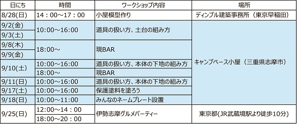 ワークショップの日にちが確定しました。まだ時間や詳細のご連絡が決まっていないものもございますが、まずはお日にちで参加できるコースをご検討下さい。水色のセルは志摩のキャンプベース小屋で行ないます。