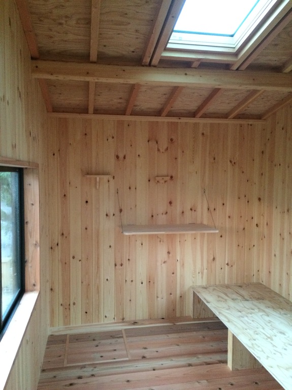 ある絵本を忠実に再現するために、天窓と収納ベンチを造りつけもらいました。大工さんもその絵本の大ファンで助かりました!細かく観察すると、いくつかの仕掛けがあります。例えば、折り畳みの小動物用のベットとか、床下から出入りする動物の入り口とか、小動物たちと秘密の星を見る会をするための、いろんな仕掛けが隠れております。