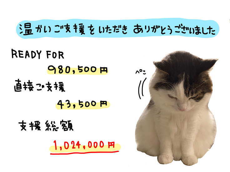 ネクストゴールはあとわずか達成できなかったものの、最初の目標金額を大きく上回るご支援をいただきました。大切に治療費に充てさせていただきます。本当にありがとうございました!